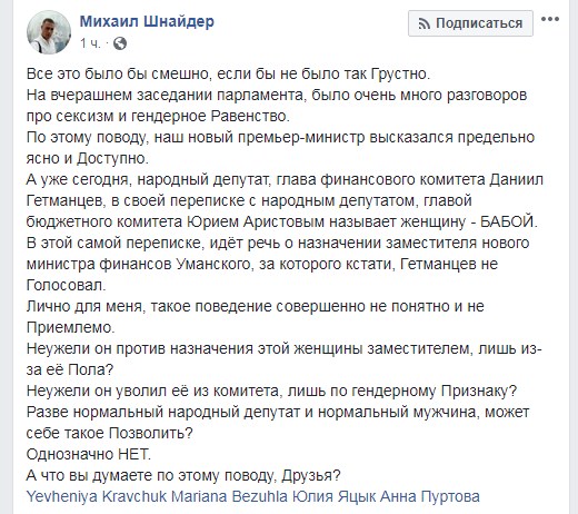 "Такое поведение совершенно непонятно и неприемлемо. Неужели он против назначения этой женщины заместителем, лишь из-за ее пола? Разве нормальный народный депутат и нормальный мужчина, может себе такое позволить? Однозначно нет", – прокомментировал блогер.