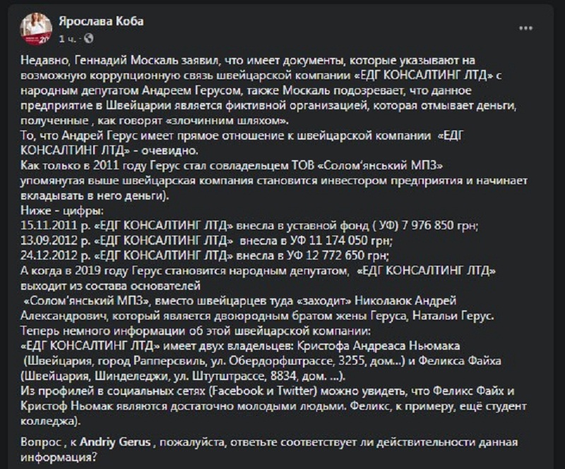 "Недавно Геннадий Москаль заявил, что имеет документы, которые указывают на возможную коррупционную связь швейцарской компании "ЕДГ КОНСАЛТИНГ ЛТД" с Андреем Герусом. Москаль подозревает, что предприятие является фиктивной организацией, которая отмывает деньги, полученные преступным путем… Как только в 2011 году Герус стал совладельцем ТОВ "Солом"янський МПЗ", компания становится инвестором предприятия и начинает вкладывать в него деньги: 15.11.2011 "ЕДГ КОНСАЛТИНГ ЛТД" внесла в уставной фонд 7 976 850 грн; 13.09.2012 - 11 174 050 грн; 24.12.2012 - 12 772 650 грн; Когда в 2019 году Герус становится народным депутатом, "ЕДГ КОНСАЛТИНГ ЛТД" выходит из состава основателей "Солом"янський МПЗ", вместо швейцарцев туда "заходит" Николаюк Андрей Александрович, который является двоюродным братом жены Геруса, Натальи Герус", – отметила Коба.