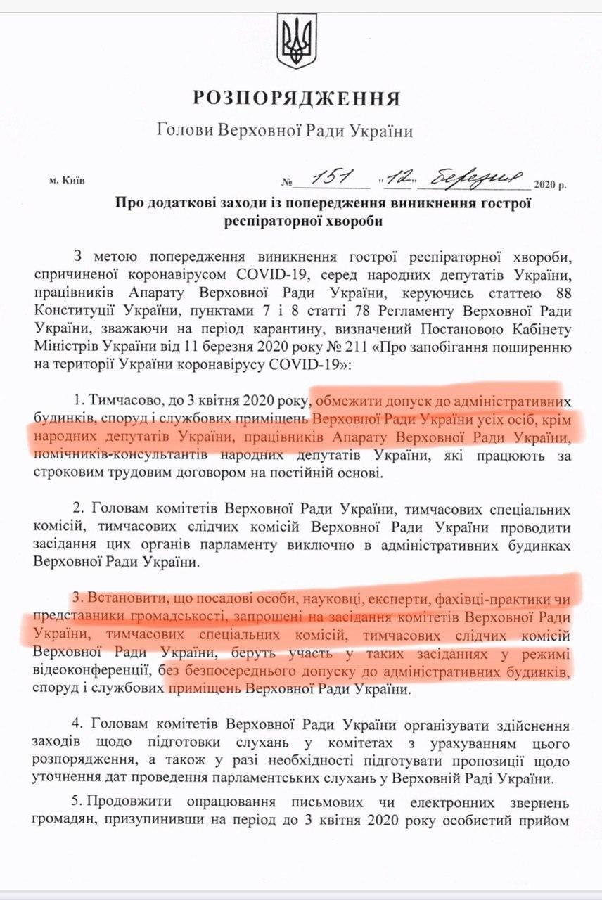 Об этом свидетельствует фотокопия распоряжения Дмитрия Разумкова об ограничительных мерах в парламенте, опубликованная в Telegram-канале нардепа Алексея Гончаренко.
