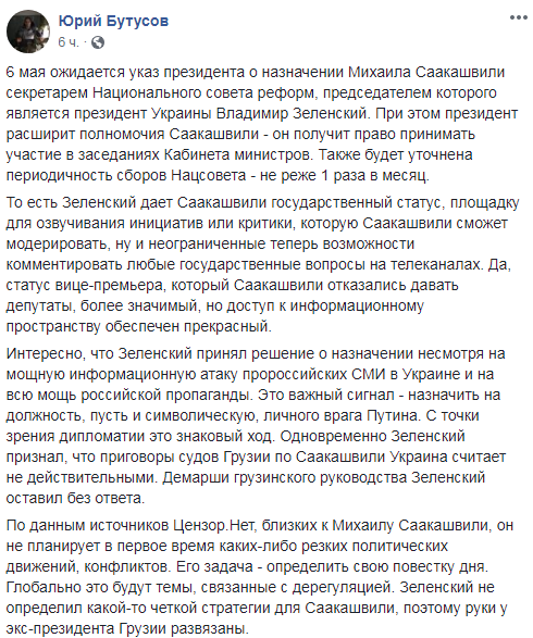 "То есть Зеленский дает Саакашвили государственный статус, площадку для озвучивания инициатив или критики, которую Саакашвили сможет модерировать, ну и неограниченные теперь возможности комментировать любые государственные вопросы на телеканалах. Да, статус вице-премьера, который Саакашвили отказались давать депутаты, более значимый, но доступ к информационному пространству обеспечен прекрасный", - отметил Бутусов.