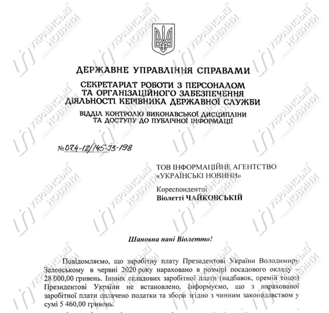 "Заработная плата президенту Украины Владимиру Зеленскому в июне 2020 года начислена в размере должностного оклада - 28 тысяч гривен", - сказано в нем.