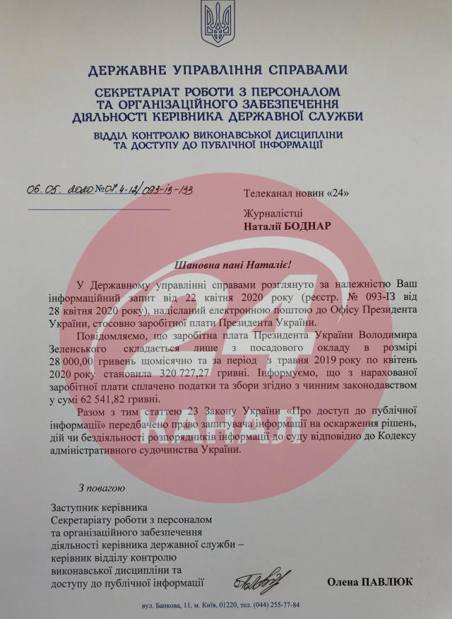 В ответ на информационный запрос журналистов, в ведомстве сообщили, что зарплата Владимира Зеленского состоит из должностного оклада, размер которого составляет 28 тысяч гривен. Таким образом с дня своей инаугурации в мае 2019 года по апрель 2020 года Зеленский получил 320 727 гривен 27 копеек.