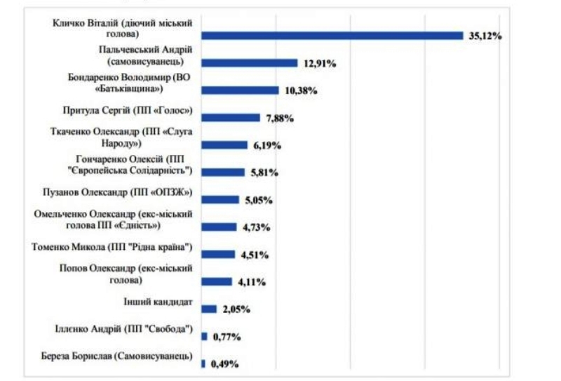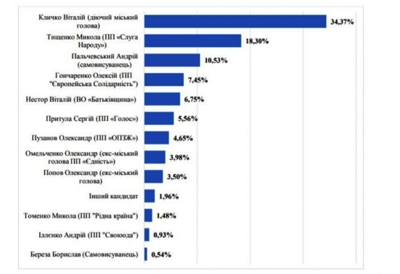 Лидером симпатий избирателей остается действующий городской глава Виталий Кличко. Если кандидатом от "Слуги народа" будет определен Тищенко, то Кличко получит 34,37% голосов избирателей. В случае выдвижения Ткаченко, то Кличко получит немного больше – 35,12%.