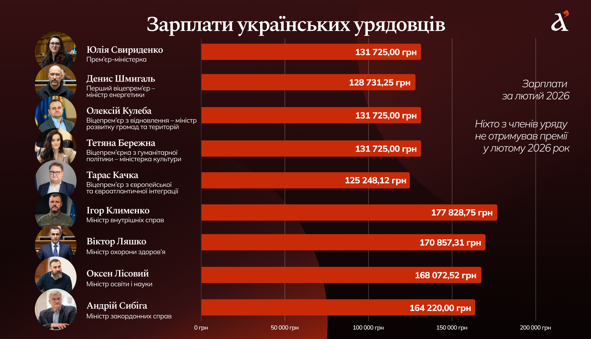 У министра здравоохранения Виктора Ляшко размер февральской зарплаты составил 170 857,31 грн, у министра внутренних дел Игоря Клименко – 177 828,75 грн.