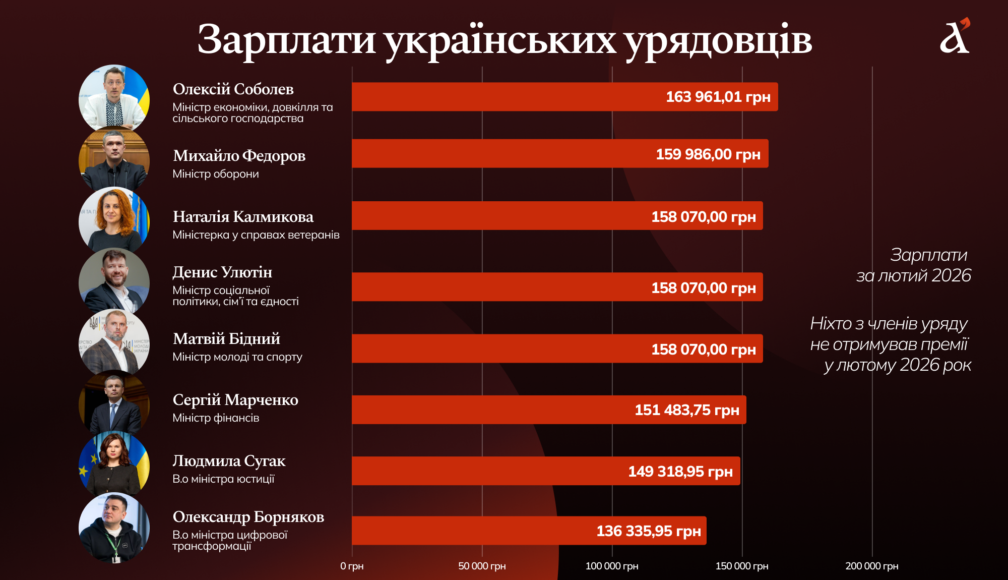 Зарплата и.о. министра юстиции Людмилы Сугак за февраль составила 149 318,95 грн, и.о министра цифровой трансформации Александра Борнякова – 136 335,95 грн.