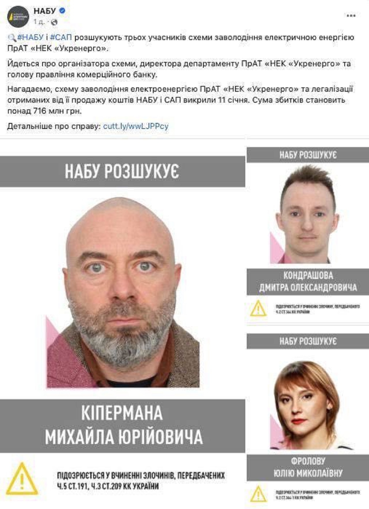 Как ранее сообщало НАБУ, в марте 2022 года "Укрэнерго" продало трейдеру "Юнайтед Энерджи" электроэнергию на сумму свыше 716 млн грн несмотря на имеющуюся у компании задолженность. "Юнайтед Энерджи" связывают с Игорем Коломойским. Трейдер перепродал энергию реальным участникам рынка, а средства вывел, чем нанес государству ущерб. НАБУ и САП объявляли в розыск подозреваемых по этому делу: организатора схемы, бывшего директора департамента ЧАО "НЭК "Укрэнерго" и председателя правления коммерческого банка Михаила Кипермана, начальника департамента администратора расчетов "Укрэнерго" Дмитрия Кондрашова и председателя Банка Альянса Юлию Фролову.
