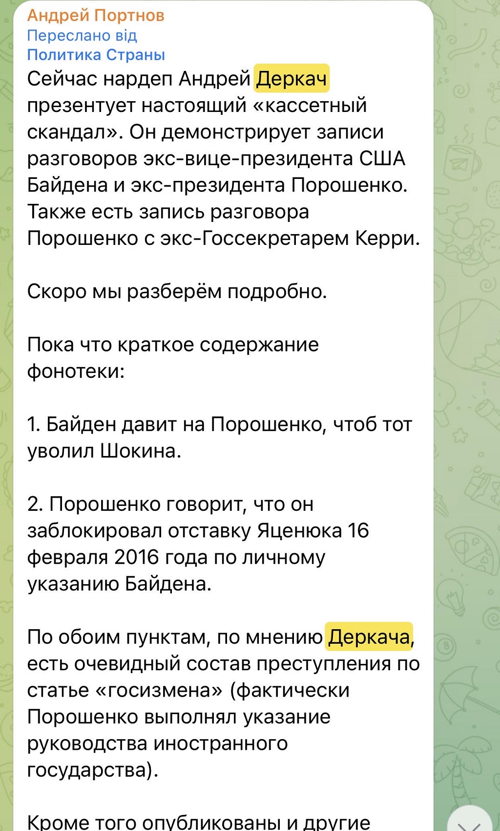 Обращает на себя внимание возможная связь Портнова с Андреем Деркачем. В частности, такой вывод можно сделать из публикаций Портнова в его телеграм-канале