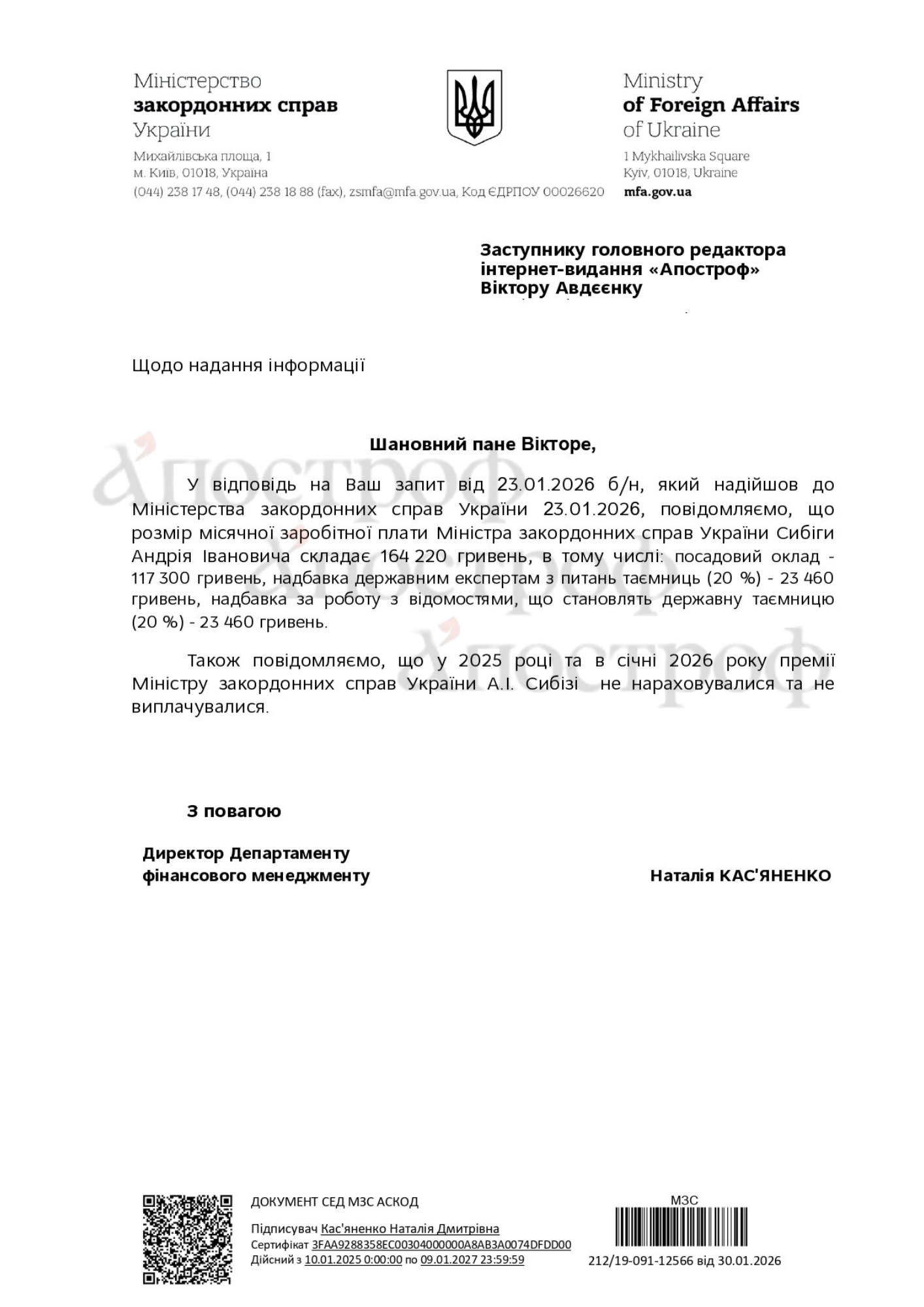 "В ответ на Ваш запрос от 23.01.2026, который поступил в Министерство иностранных дел Украины 23.01.2026, сообщаем, что размер месячной заработной платы министра иностранных дел Украины Сибиги Андрея Ивановича составляет 164 220 гривен, в том числе: должностной оклад - 117 300 гривен, надбавка государственным экспертам по вопросам тайн (20%) – 23 460 гривен, надбавка за работу со сведениями, составляющими государственную тайну (20%) – 23 460 гривен", - сообщает МИД.