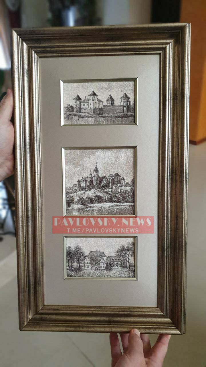 Но также Шевченко вручили и другие презенты: настойку и панно белорусских мастеров, выполненное на ткани в технике авторской вышивки.