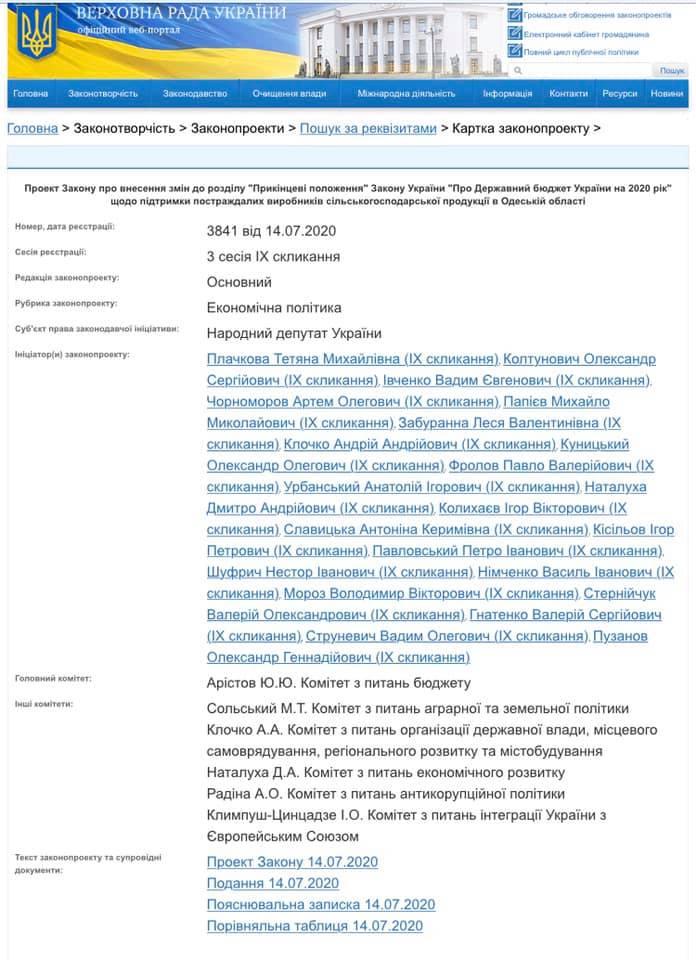 "Инициировала законопроект, который позволит наконец-то компенсировать фермерам Одесчины понесенные потери урожая из-за засухи. Ведь без изменения в законодательство правительство так и не смогло найти механизмов оказания помощи аграриям. Быстро и без изменения в законы Кабмин может выделить средства только Албании", – посетовала парламентарий.