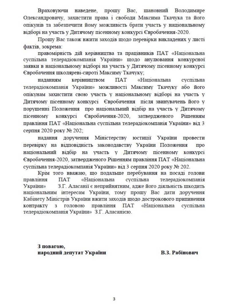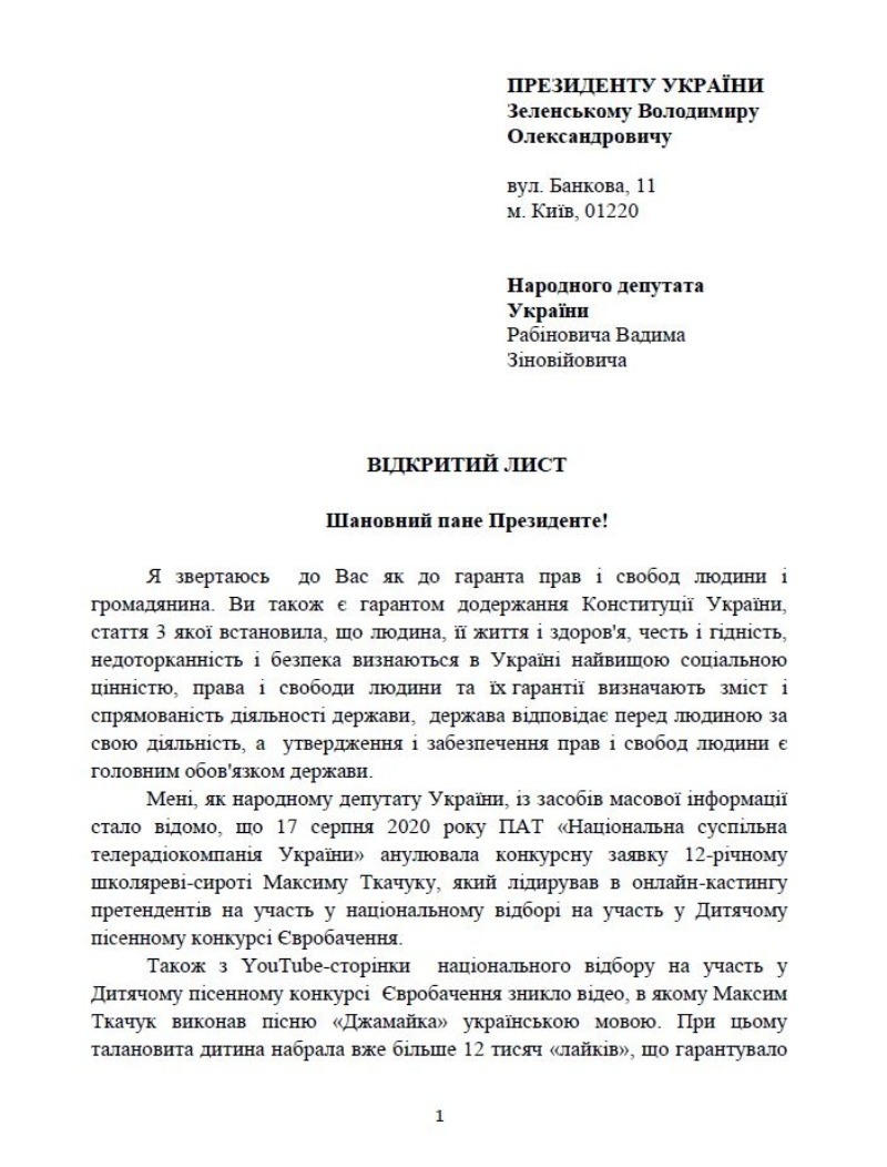 Народный депутат Украины, сопредседатель политической партии "Оппозиционная платформа - За життя" Вадим Рабинович направил открытое письмо на имя президента Украины Владимира Зеленского, в котором просит защитить права и свободы Максима Ткачука и его опекунов, а также обеспечить школьнику-сироте возможность принимать участие в национальном отборе на участие в Детском песенном конкурсе "Евровидение-2020".