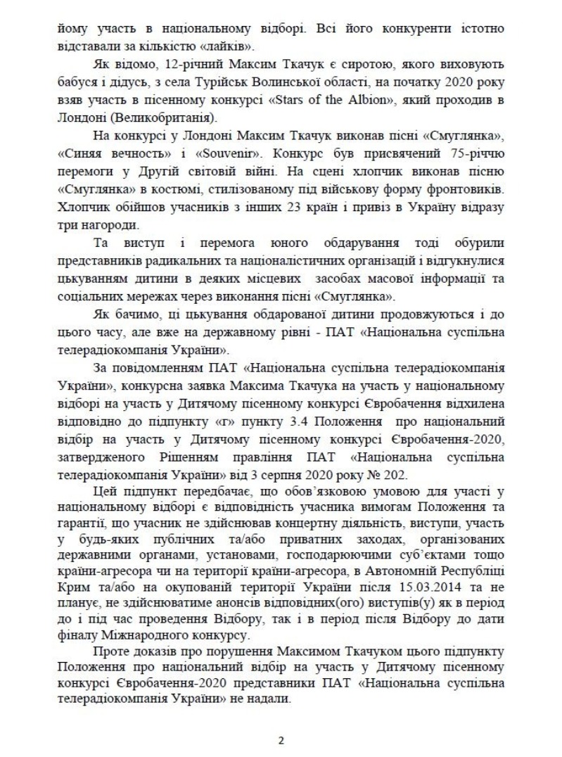 В открытом письме сопредседатель партии "Оппозиционная платформа – За життя" просит главу государства принять меры и проверить правомерность действий руководства и сотрудников ПАТ "Национальная общественная телерадиокомпания Украины" относительно аннулирования конкурсной заявки в национальном отборе на участие в Детском песенном конкурсе "Евровидение" школьнику-сироте Максиму Ткачуку.