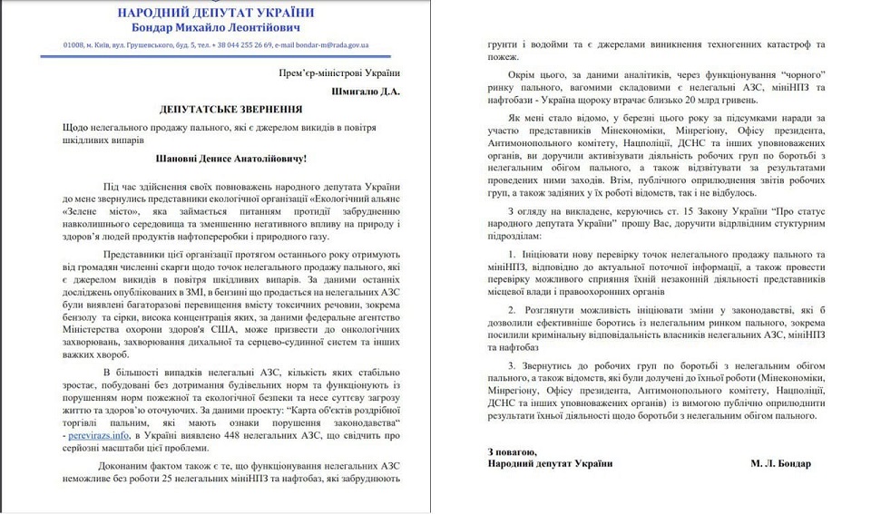 Михаил Бондарь сообщает, что функционирование нелегальных АЗС невозможно без работы 25 нелегальных миниНПЗ, которые, по его словам, "загрязняют почвы и водоемы, являются источниками возникновения техногенных катастроф и пожаров". В своем обращении к премьеру он призвал проверить нелегальные АЗС и миниНПЗ, инициировать изменения в законодательстве и посодействовать, чтобы ведомства, которые были привлечены к борьбе с нелегальным рынком топлива, обнародовали отчеты своей работы.