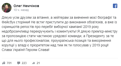 "Я благодарю премьер-министра за предложением стать частью правительственной команды, а президенту за то, что для него профессионализм, проукраинская позиция и искоренения коррупции во власти является приоритетом над тем, как ты голосовал в 2019 году!" – написал Немчинов.