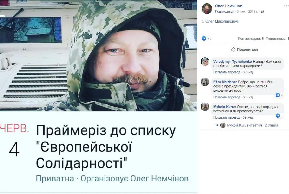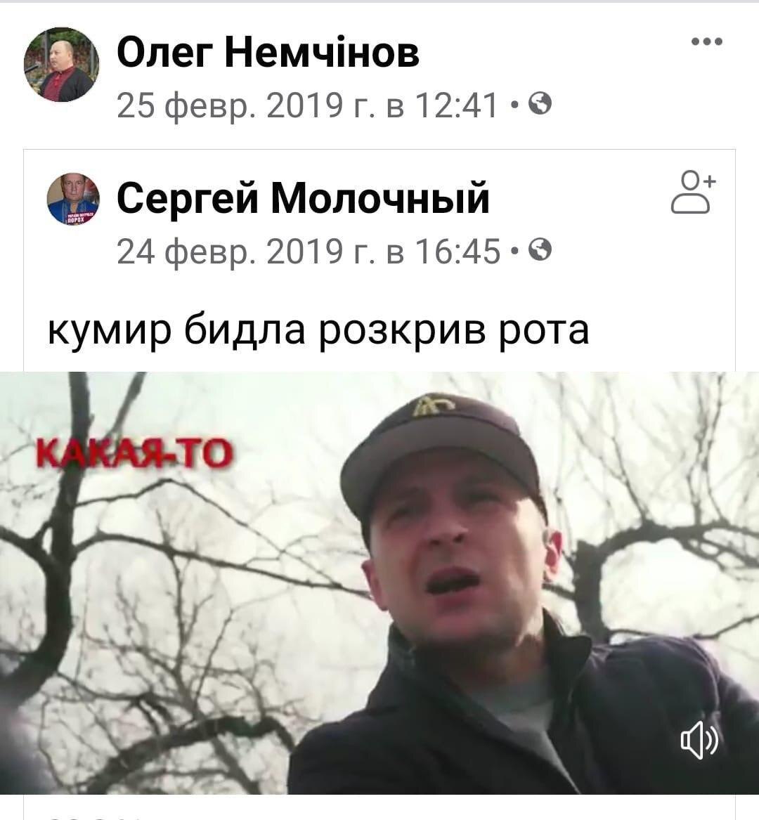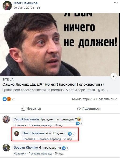 Ранее Немчинов нелестно отзывался в интернете о тогда еще кандидате в президенты Зеленском и активно поддерживал его предшественника Петра Порошенко.