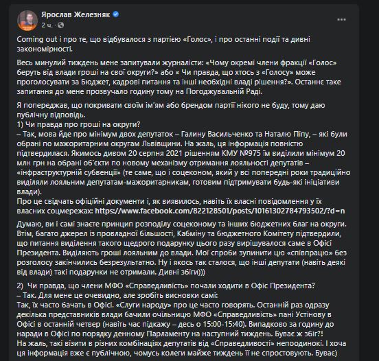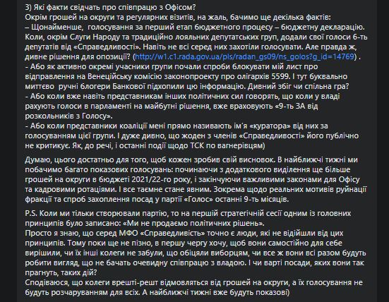 По словам нардепа, депутаты из группы "Справедливость" (фракция "Голос") Галина Васильченко и Наталья Пипа получили минимум 20 млн гривен на выбранные объекты на своих округах в качестве подарка от Офиса президента. Такие "подарки" - это способ получить лояльность при голосовании за законы власти и бюджет, убежден Железняк. Кроме того, глава "Справедливости" Александра Устинова регулярно посещает совещания в Офисе президента, в последний раз ее там видели 16 сентября с 15:00 до 15:40, что почти совпало с обсуждением повестки дня парламента.