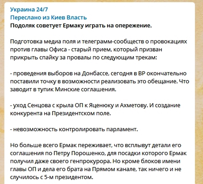 "Подготовка медиа поля и телеграмм-сообществ о провокациях против главы Офиса - старый прием, который призван прикрыть спайку за провалы по следующим трекам: