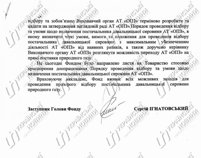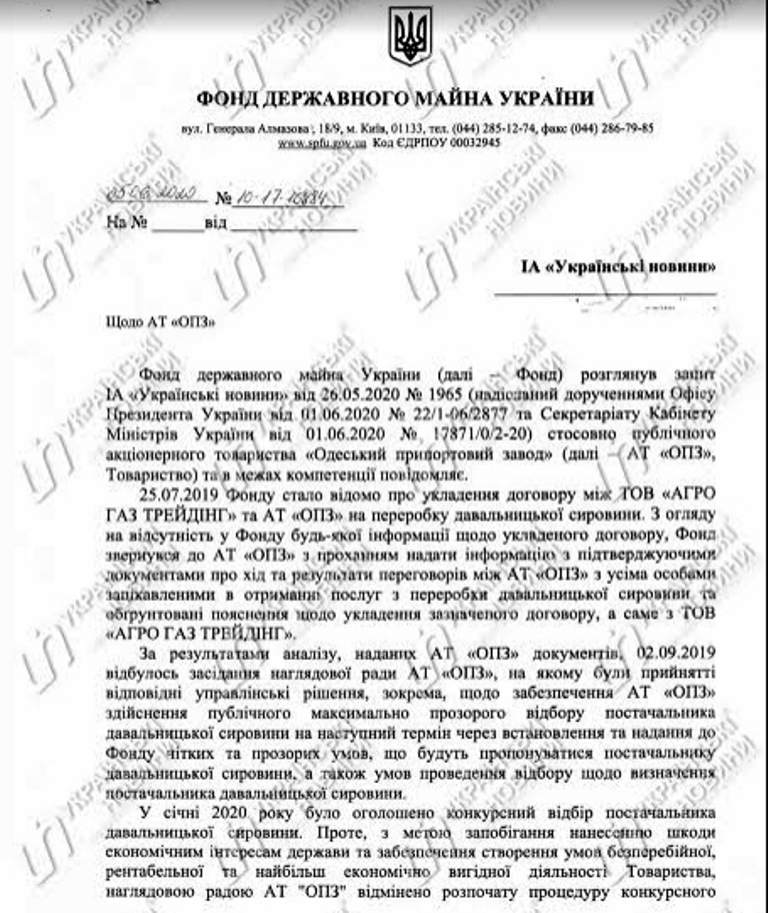 "Фондом были направлены письма в Общество по ускорению доработки Порядка проведения отбора и условия по определению поставщика давальческого сырья AО ОПЗ (Акционерное общество Одесский припортовый завод)", – говорится в ответе ФГИУ.
