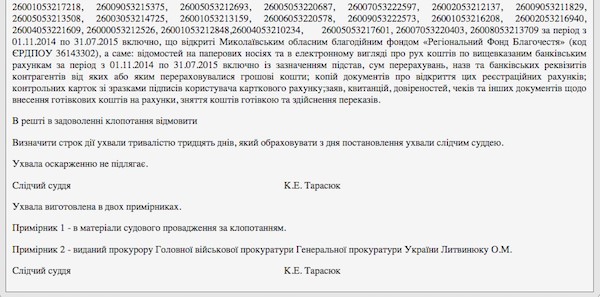 "Среди перечисленных "ЛИЦ" скрываются тогдашние работники МО Юрий Гусев и Давид Арахамия. А "Регіональний фонд благочестя" является Николаевским областным благотворительным фондом (код ЕРДПОУ 36143302), который напрямую связан с Давидом Арахамией - через этот фонд, в соответствии с постановлением суда, фигуранты получали свои "откаты", – говорится в блоге.