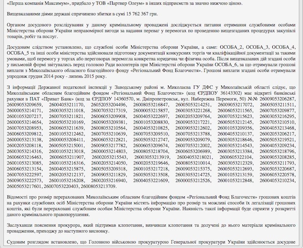 Департаментом госзакупок и поставок материальных ресурсов Минобороны 09.10.2014 заключен договор о поставке топлива для реактивных двигателей из ООО "Перша компанія Максимум". Топливо ООО "Перша компанія Максимум", приобрело у ООО "Партнер Олеум" и других предприятий за более низкую цену. Этим государству нанесен ущерб на 15 762 367 грн. Органом досудебного расследования в уголовном производстве исследуется вопрос получения должностными лицами МОУ неправомерной выгоды из-за предоставления преимуществ в победах по проведению процедур закупки товаров. Досудебным следствием установлено, что должностные лица Минобороны, а именно: ЛИЦО_2, ЛИЦО_3, ЛИЦО_4, ЛИЦО_5 и другие осуществляли подготовку документации конкурсных торгов или квалификационной документации по таким условиям, чтобы победу в торгах получило конкретное лицо. Упомянутые лица в письменной форме отчитывались перед главой Совета волонтеров при Минобороны ЛИЦО_6, за что получали выплаты из Николаевского областного БФ "Регіональний Фонд Благочестя". Выплаты получали в течение декабря 2014 - июля 2015.