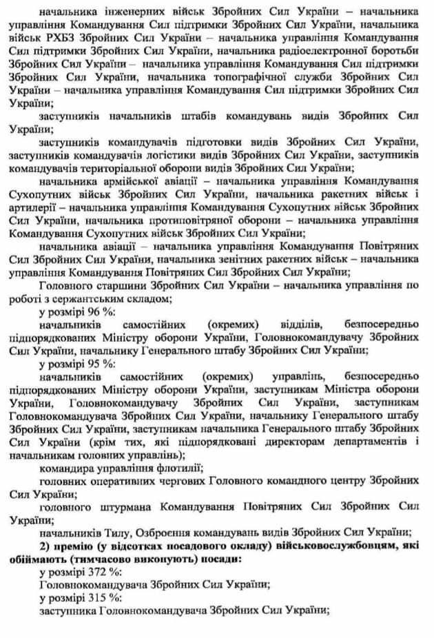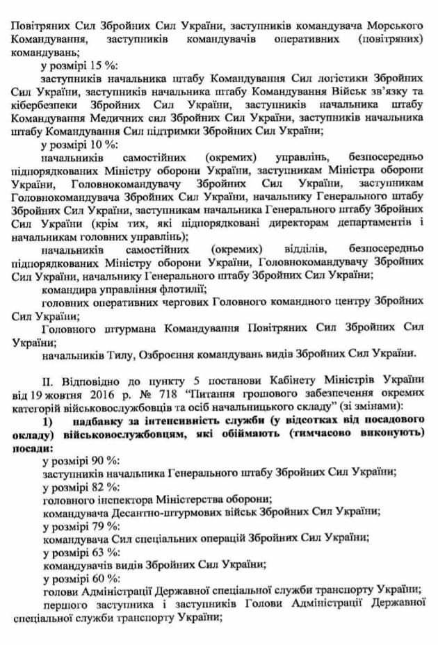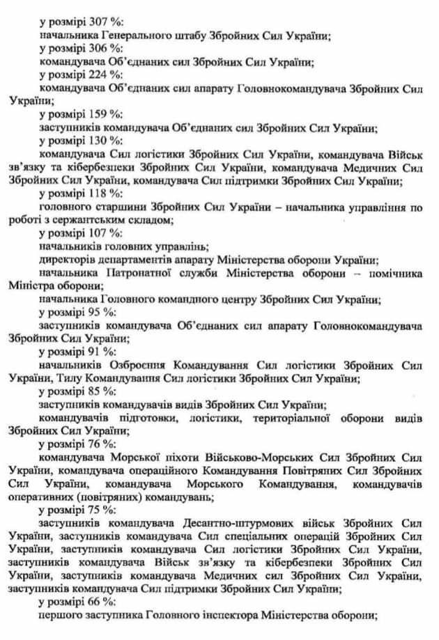 В документах указано, что самую высокую надбавку – в 372% от текущих выплат - должен получить главнокомандующий Вооруженных Сил Украины, его заместитель – 315%, начальник Генерального штаба – 307%, командующий Объединенных сил – 306%. В то же время за особенности прохождения службы всему руководству украинской армии предлагается выплатить надбавку в 100%. В то же время самые низкие надбавки – около 10% - предлагается выплатить начальникам подразделений в тылу и отдельных подразделений, подчиненных Минобороны.