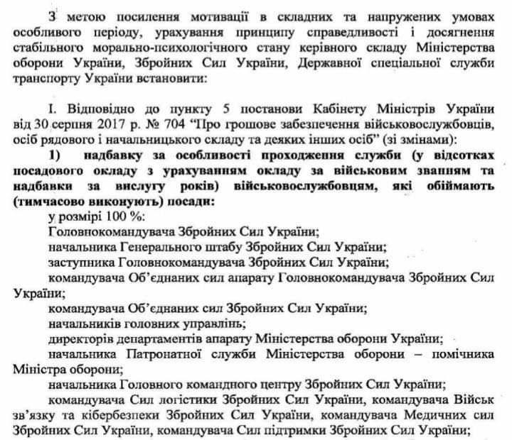 Руководство Вооруженных Сил Украины обратилось к министру обороны и правительству с просьбой начислить им дополнительные надбавки на особый период в размере от 372% до 10%, в зависимости от ранга.