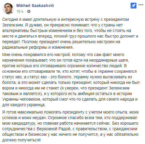 "В основном его отговаривали те, кто хотят, чтобы в Украине сохранялся статус кво, а статус кво - это болото. Украину нужно вытаскивать из болота, а это может сделать только президент, который никогда не был вором и никогда им не станет (я уверен, что президент Зеленским таковым и является), и у которого есть амбиция остаться в истории Украины человеком, который смог что-то сделать для своего народа и для каждого украинца", - написал Саакашвили.