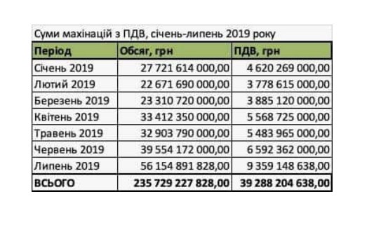 По данным за январь-июль 2019 объем преступных схем предыдущей власти составляет 235 млрд грн. Так, в указанный период только на НДС украли по меньшей мере на 39,3 млрд грн.