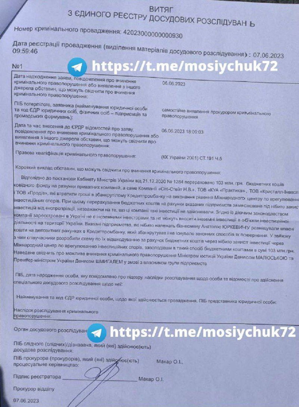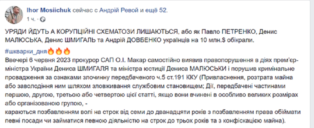 По словам Мосийчука, уголовное производство возбуждено Специальной антикоррупционной прокуратурой 6 июня 2023 по признакам преступления, предусмотренного ч.5 ст.191 УКУ (Присвоение, растрата имущества или завладение им путем злоупотребления служебным положением совершенные в особо крупных размерах или организованной группой). Соответствующее преступление может повлечь до 12 лет тюрьмы.