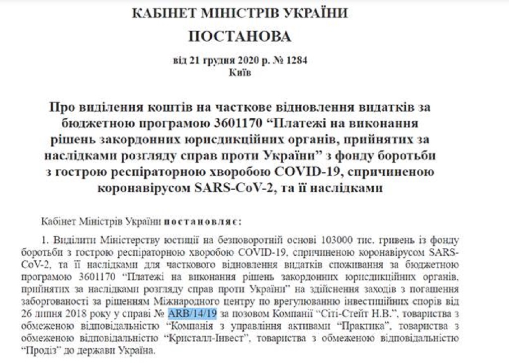 Тогдашний министр юстиции Павел Петренко вместо того, чтобы сообщить арбитражу, что это не инвестиции, а депозит, согласился участвовать в суде, выделил 450 тыс. евро для юридической фирмы Foley Hoag AARPI за представительство Украины. Украина суд проиграла и в сентябре 2019, адвокаты Юркевича обращаются в Киевский апелляционный суд с целью легализации решения международного арбитража. 16 сентября 2019 Киевский апелляционный суд выносит определение, согласно которому иск Сity-State NV о возврате средств удовлетворить в связи с исполнением решения Международного арбитража по делу № АRB/14/19. Однако по данному номеру на сайте Международного суда находится решение по делу по Сенегалу.