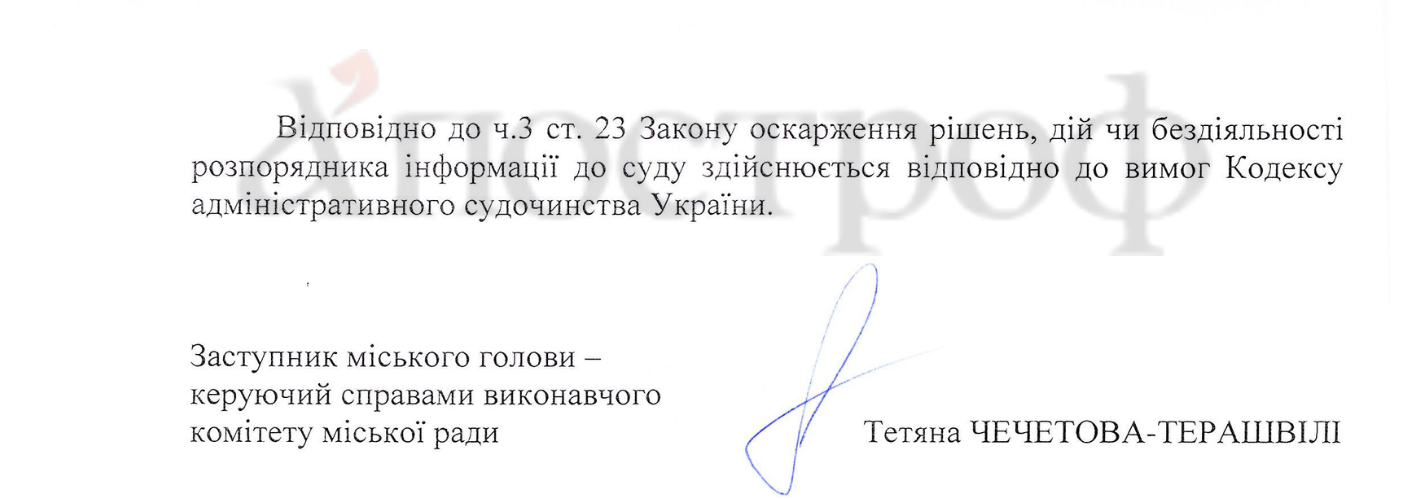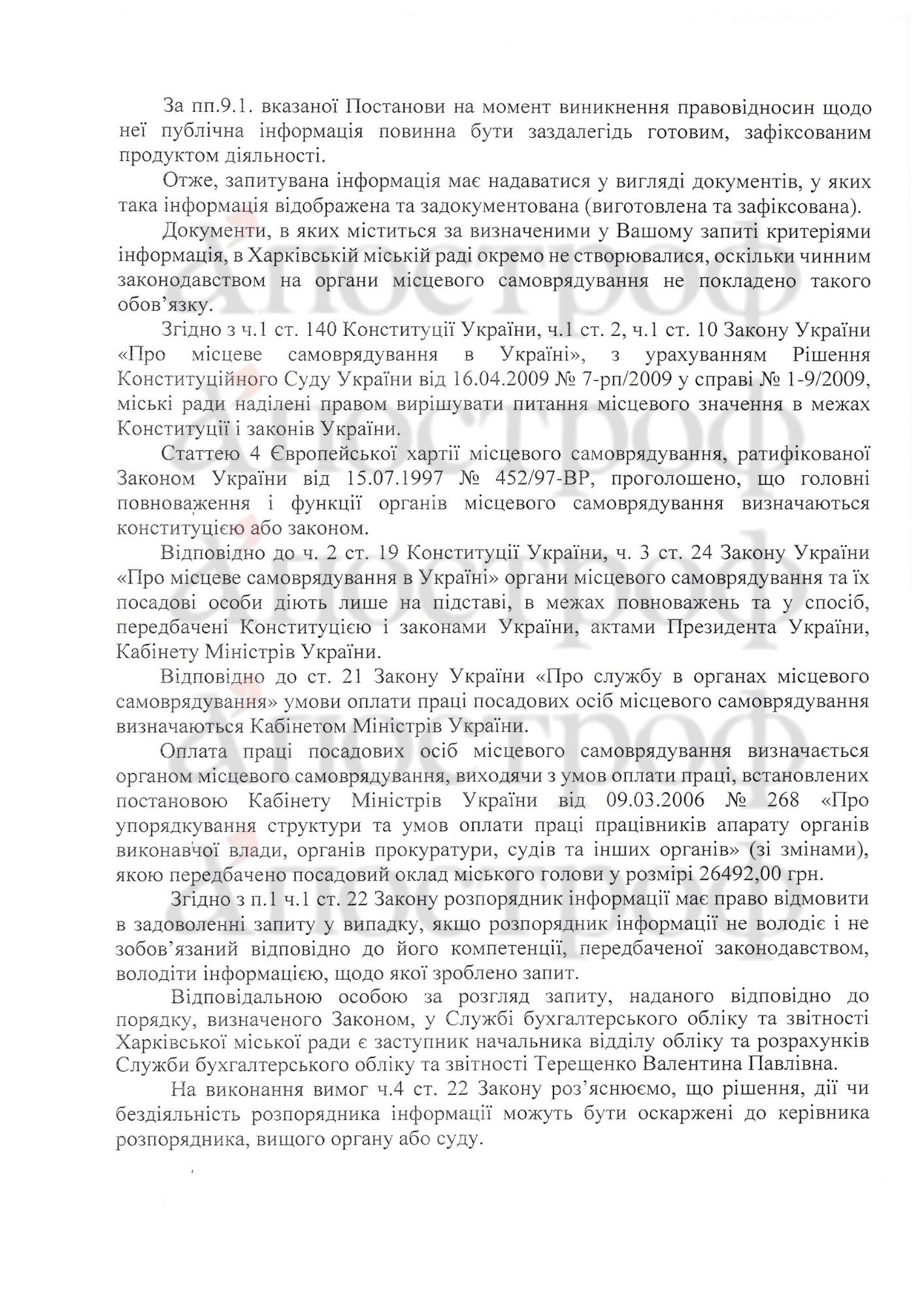 "... запрашиваемая информация должна предоставляться в виде документов, в которых такая информация отражена и задокументирована (изготовлена и зафиксирована). Документы, в которых содержится по определенным в Вашем запросе критериям информация, в Харьковском городском совете отдельно не создавались, поскольку действующим законодательством на органы местного самоуправления не возложена такая обязанность".