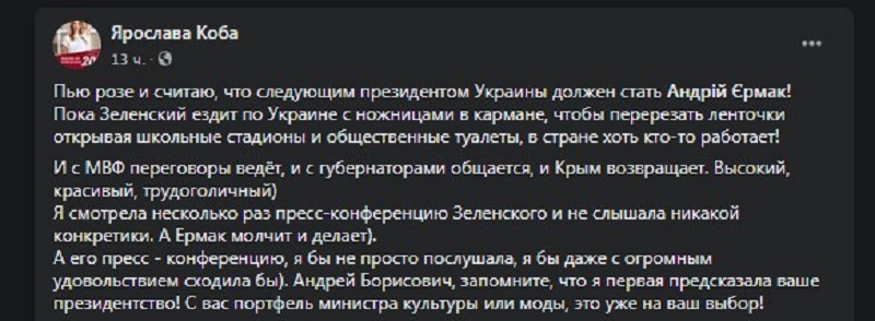 "Пью розе и считаю, что следующим президентом Украины должен стать Андрей Ермак! Пока Зеленский ездит по Украине с ножницами в кармане, чтобы перерезать ленточки открывая школьные стадионы и общественные туалеты, в стране хоть кто-то работает!", - пишет она, прикрепив к посту скриншоты страницы Офиса президента Украины.