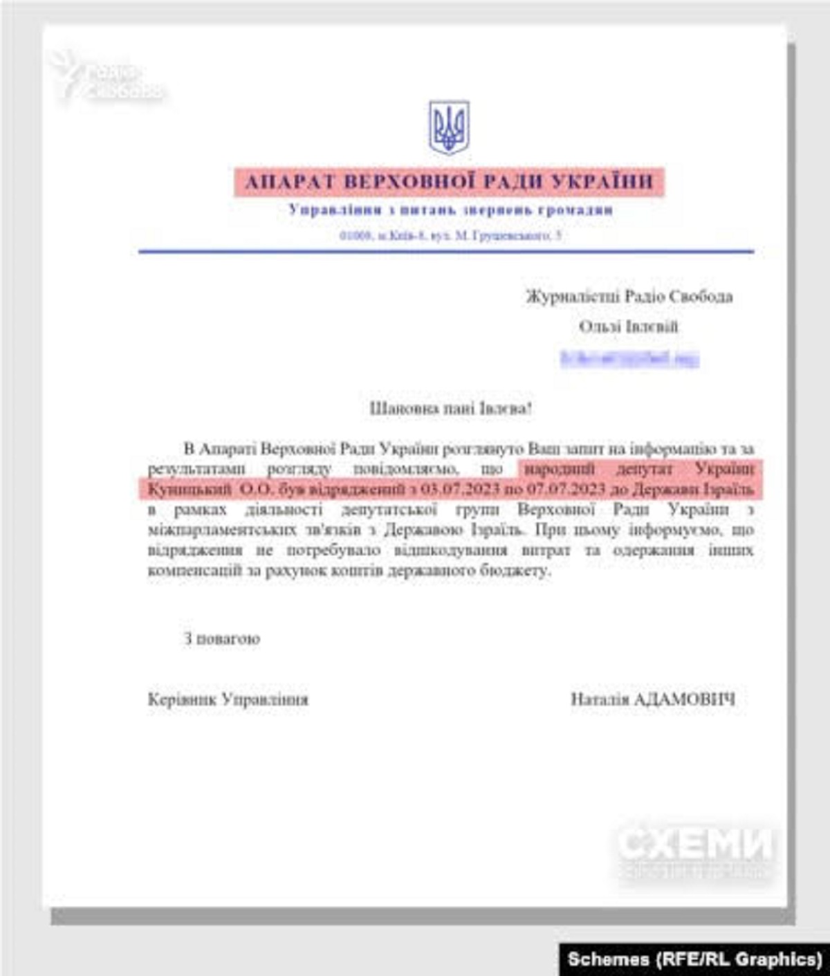 В аппарате парламента по запросу "Схем" сообщили, что Александр Куницкий был в командировке с 3 по 7 июля в Израиль в рамках деятельности депутатской группы Верховной рады по межпарламентским связям с Израилем. На сайте ВР информация о деятельности депутатской группы по межпарламентским связям с Государством Израиль не обновлялась с октября 2021. Кроме отчета Куницкого и ответа на запрос других последствий от визита, который осуществлялся за счет бюджета, нет.