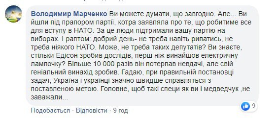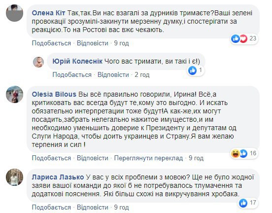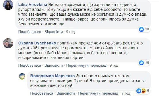 При этом в комментариях под новостью пользователи раскритиковали ее объяснения, отметив и слабую согласованность слов политиков с заявленной позицией президентской партии, и отсутствие опыта и слабую теоретическую подготовку. Следует отметить, что были и позитивные комментарии – нардепа хвалили за смелость и искренность.
