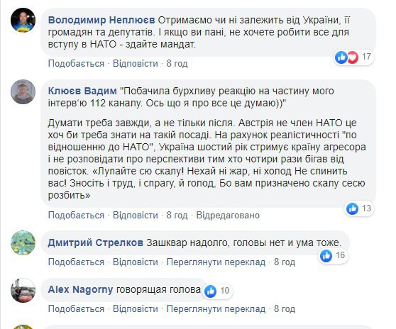 Также член парламентского комитета объяснила свои слова относительно сотрудничества НАТО и России, а также отметила, что для мгновенного вступления Украины в альянс без влияния на это решение РФ, необходимо чтобы изменилась "парадигма" НАТО.
