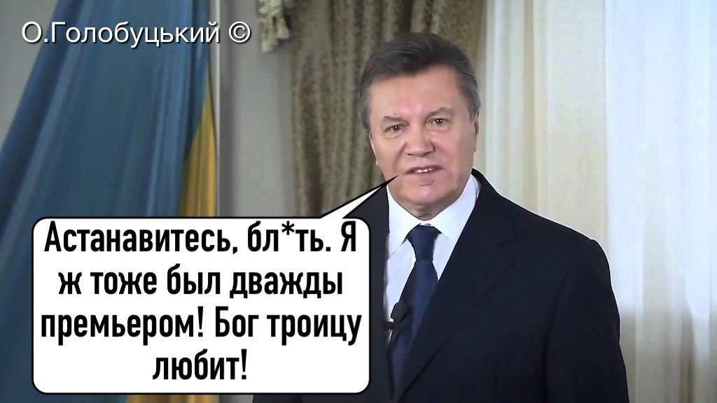 На одной из картинок изображен бывший однопартиец Тигипки, экс-президент Виктор Янукович, который произносит свое знаменитое "Остановитесь!" и добавляет, что уже два раза был премьер-министром, а бог любит троицу.