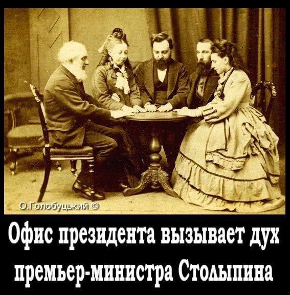 На третьей картинке изображен спиритический сеанс, на котором члены Офиса президента вызывают дух премьер-министра Столыпина.