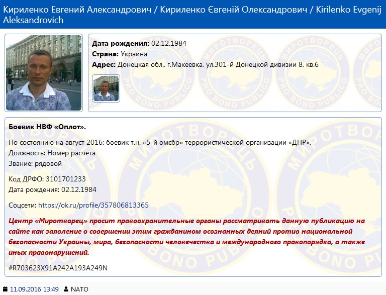 При этом издание отмечает, что в базе украинского сайта "Миротворец" числится боевик ДНР Евгений Александрович Кириленко. Он родился в 1984 году, и был зарегистрирован в Макеевке по тому же адресу, что и Павел Кириленко.