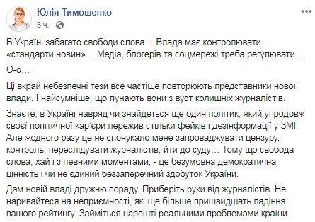 Об этом написала Юлия Тимошенко в Facebook, комментируя заявления представителей команды президента Зеленского о том, что власти намерены контролировать "стандарты новостей", регулировать деятельность медиа и соцсетей.
