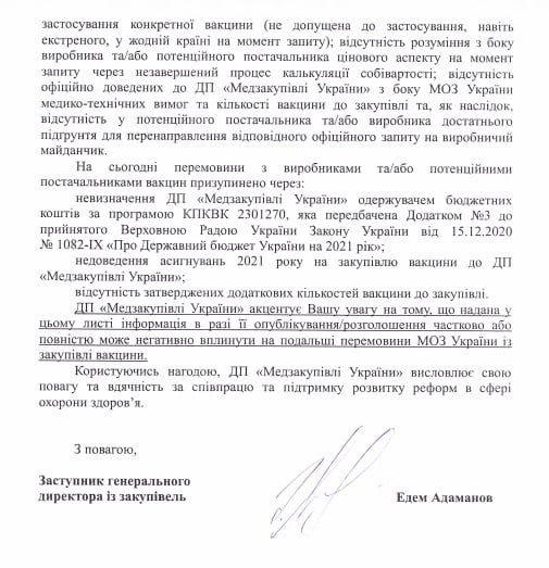 "То есть, кроме обещанных 8 миллионов доз помощи от COVAX, по состоянию на начало 2021 года Украина, как государство, не имела ни одной законтрактованной дозы вакцины. Еще 5 миллионов доз" Лекхим "хочет, в частности, распродать самостоятельно предприятиям. Другой вакцины ни у кого другого все равно не получится купить, ведь ни одна другая вакцина не зарегистрирована в Украине. И наибольшие шансы на регистрацию имеет только российский "Спутник V" ", - резюмировала нардеп.