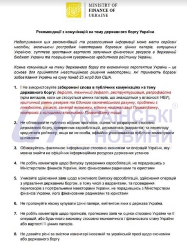 В рекомендациях отмечается, что комментарии по вопросам госдолга для иностранных и украинских СМИ не должны отличаться.