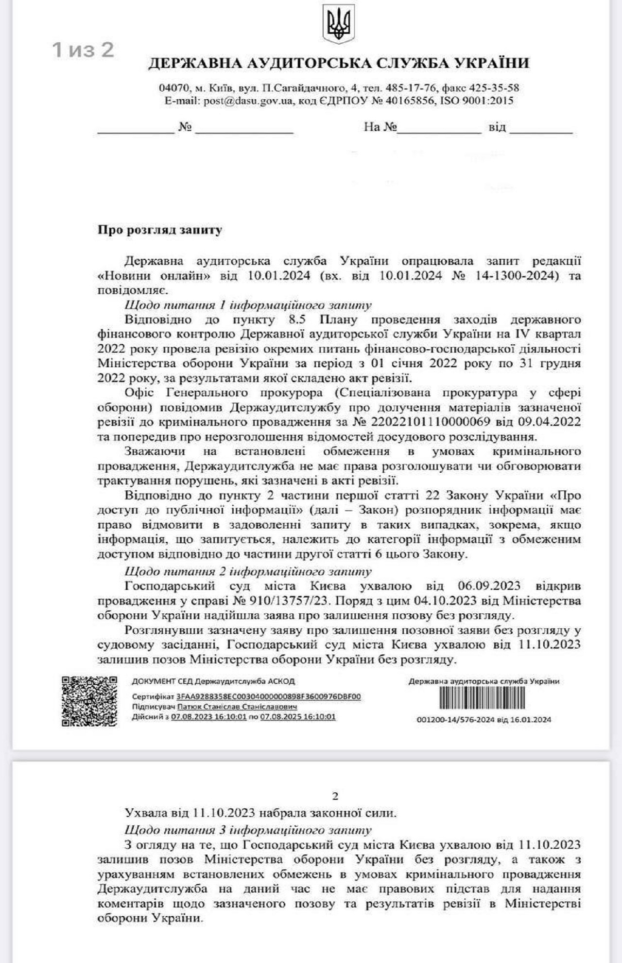 "Хозяйственный суд города Киева определением от 06.09.2023 открыл производство по делу No 910/13757/23. Наряду с этим 04.10.2023 от Министерства обороны Украины поступило заявление об оставлении иска без рассмотрения. Рассмотрев указанное заявление об оставлении искового заявления без рассмотрения на судебном заседании, Хозяйственный суд города Киева определением от 11.10.2023 оставил иск Министерства обороны Украины без рассмотрения", – говорится в тексте ответа Службы.
