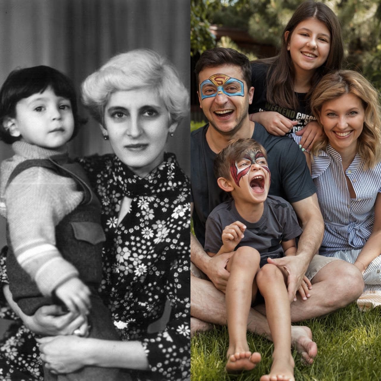 Слева: Владимир Зеленский со своей мамой. Справа: Зеленский со своей женой и детьми