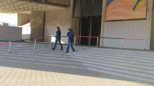 На здании уже вывесили флаги Украины с черными лентами и разместили ограждающие полоски во избежание образования толпы.