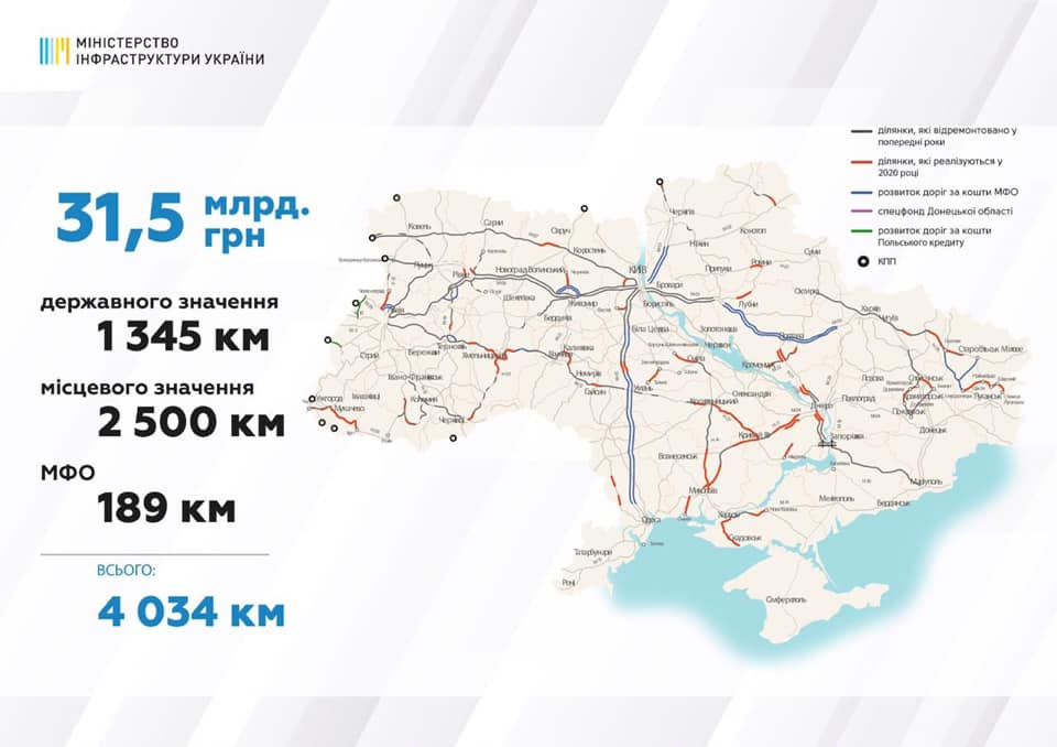 Правительство уже запланировал восстановить 1345 км дорог государственного значения и 3711 погонных метров мостов. Прежде всего, ремонтировать будут наиболее разрушенные участки автомобильных дорог по основным маршрутам и продолжат строительство и ремонт объектов, работы на которых начаты в прошлые годы: М-12 Стрый - Тернополь - Кропивницкий - Знаменка (через г.. Винницу), Н-31 Днепр - Царичанка - Кобеляки - Решетиловка, Строительство южного обхода г.. Днепра, Н-26 Чугуев - Меловое (через г.. Старобельск), Н-23 Кропивницкий - Кривой Рог - Запорожье, Н-14 Александровка - Кропивницкий - Николаев, Н-11 Днепр - Николаев (через г.. Кривой Рог), Н-03 Житомир - Черновцы.