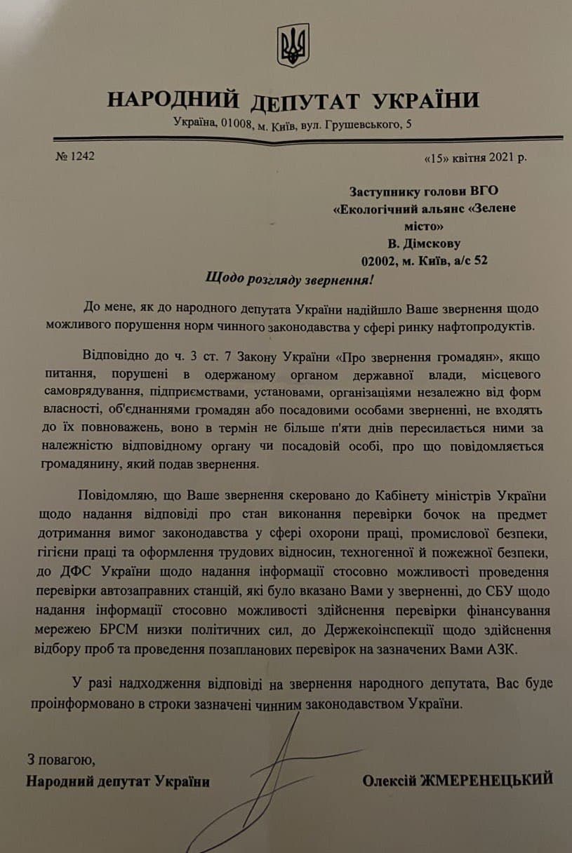 "Сообщаю, что Ваше обращение направлено в Кабинет министров Украины насчет предоставления ответа о состоянии выполнения проверки точек на предмет соблюдения требований законодательства в сфере охраны труда, промышленной безопасности, гигиены труда и оформления трудовых отношений, техногенной и пожарной безопасности, в ГФС Украины о предоставлении информации насчет возможности проведения проверки автозаправочных станций, которые были указаны Вами в обращении, в СБУ о предоставлении информации насчет возможности осуществления проверки финансирования сетью БРСМ ряда политических сил, в Госэкоинспекцию по осуществлению отбора проб и проведения внеплановых проверок по указанным Вами АЗК", - написал нардеп Жмеренецкий в ответ на обращение.