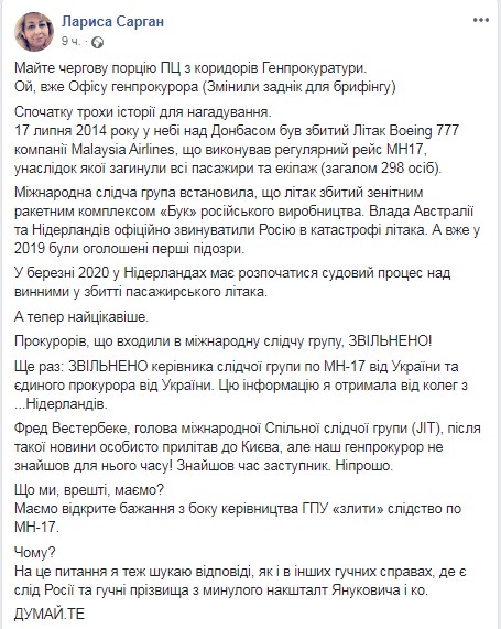 "В марте 2020 года в Нидерландах должен начаться судебный процесс над виновными в сбивании пассажирского самолета. А теперь самое интересное. Прокуроры, входившие в международную следственную группу, уволены. Еще раз: уволен руководитель следственной группы по МН-17 от Украины и единый прокурор от Украины", - уточнила она.