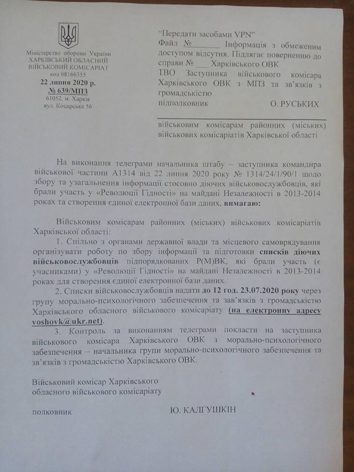 В сети опубликовали документ, согласно которому в ВСУ собирают информацию о действующих военнослужащих, в 2013-2014 годах были участниками Революции Достоинства.