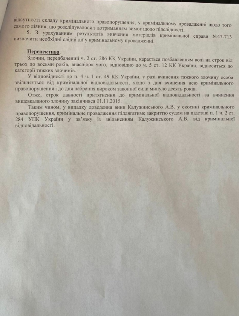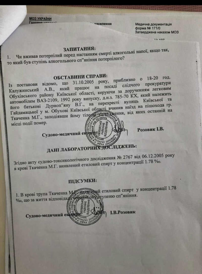 "При таких обвинениях работнику прокуратуры Калужинскому грозило до 10 лет тюрьмы. Однако спустя почти 4 месяца в деле появилось заключение токсикологической экспертизы, согласно которой у Ткаченко в крови нашли 1,78 промилле этилового спирта, что соответствует средней степени опьянения. Исходя из этого была проведена автотехническая экспертиза. Эксперты указали, что водитель ВАЗ 2109 якобы не имел технической возможности избежать наезда. Поэтому уголовное дело было закрыто на основании п.2 ст.6 УПК Украины (в редакции 1960 г.) - из-за отсутствия состава преступления.