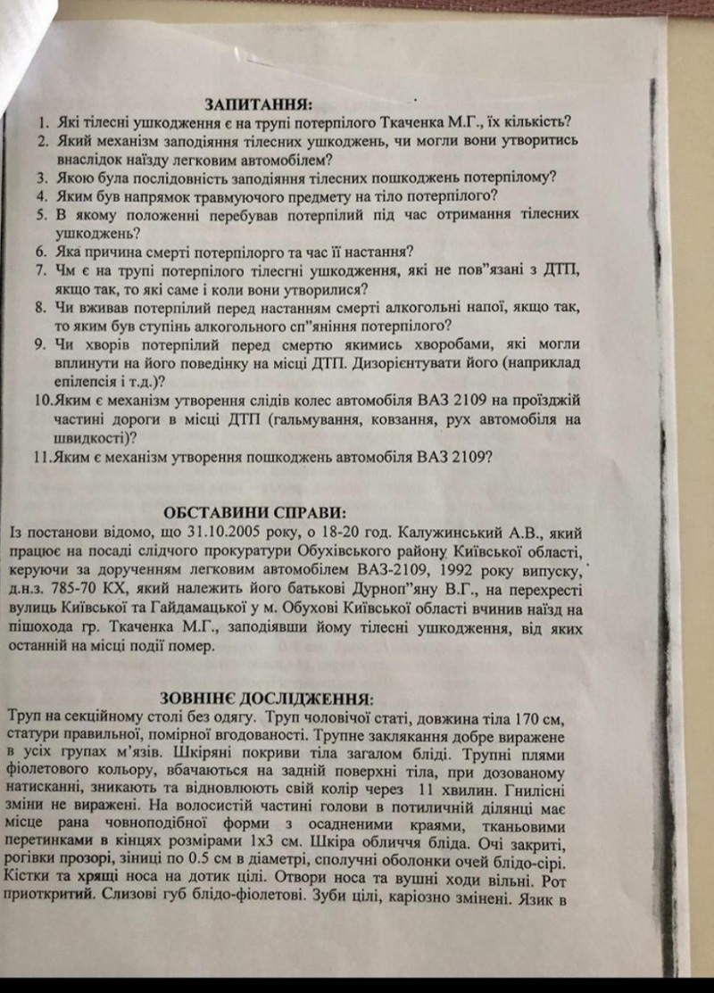 Документы следствия говорят, что судмедэкспертиза (СМЭ) была назначена постановлением следователя прокуратуры Гвоздя 8 ноября 2005 - спустя восемь дней после аварии, хотя в таких случаях экспертизу назначают неотложно. В заключении экспертизы написано, что пешеход находился в вертикальном положении, двигался и первый удар автомобиля пришелся ему по ногам, а последующие травмы он получил при ударе и падении на капот автомобиля.